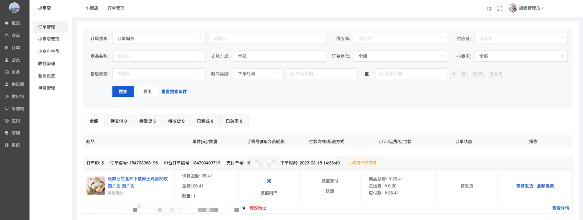 显示全部小商店的店铺订单,下单会员为小商店小程序会员,金额为小商店自主定价金额,支付方式为小商店小程序微信支付。